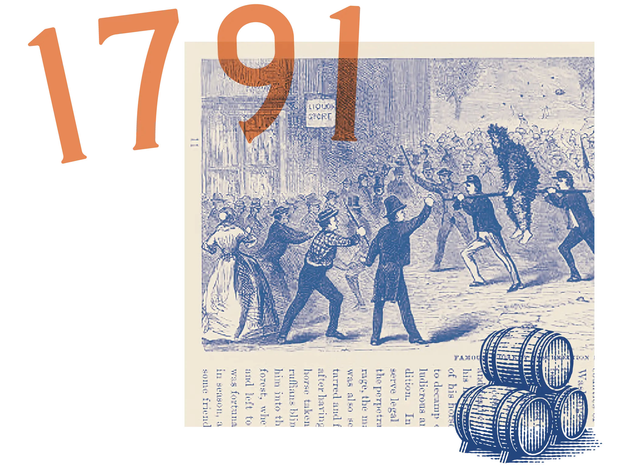 Domestic whiskey taxation sparks an armed uprising. President Washington rides at the head of 13,000 militia — proof that spirits were central to the fabric of the young nation.
